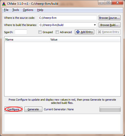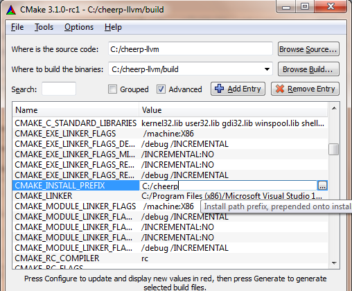 Wait until the project is configured. Now you need to tick the Advanced box, set the LLVM_INSTALL_PREFIX variable to “C:\cheerp” and press Configure again.