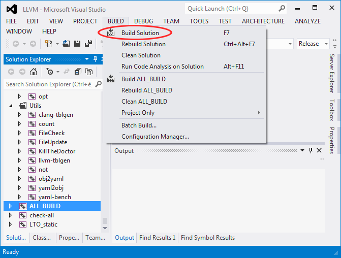 Make sure the ALL_BUILD project is selected and Release mode is enabled, then click Build Solution